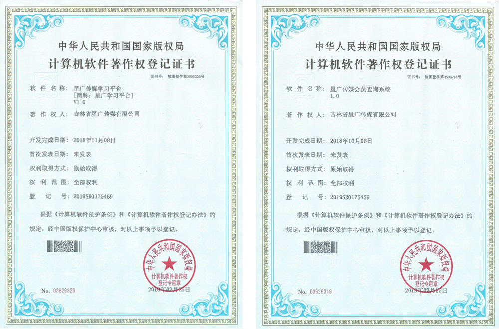 喜訊!喜訊!星廣傳媒又有喜訊啦! 熱烈祝賀我公司自主研發(fā)的學(xué)習(xí)平臺和會員查詢系統(tǒng)獲得了計算機(jī)軟件著作權(quán)登記證書!